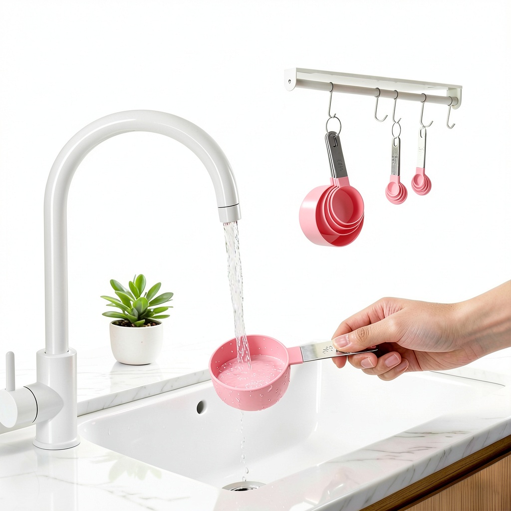 The cups and spoons nest together and are held by a detachable steel ring, keeping them organized and saving cabinet space.